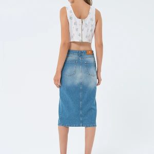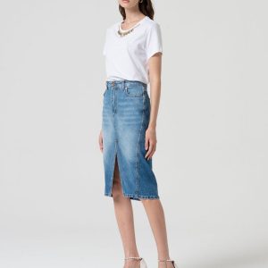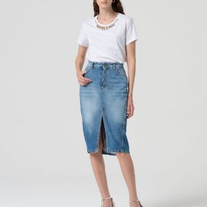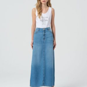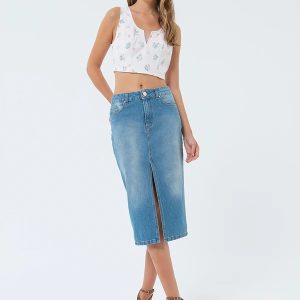 Dodajte svoji garderobi pridih vsakodnevne elegance z dolgim krilom iz jeansa v regular fit kroju. Krilo ima srednjo višino pasu, pet praktičnih žepov in razporek na sprednjem delu za bolj sproščen in sodoben videz. Kot poseben detajl je vključena kovinska verižica, ki doda pridih stila. Idealen kos za kombiniranje s casual majicami ali bolj formalnimi bluzami za vsestranske priložnosti.
