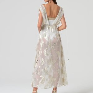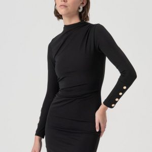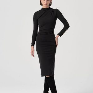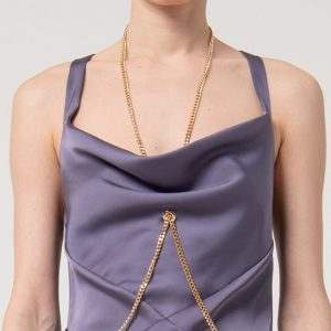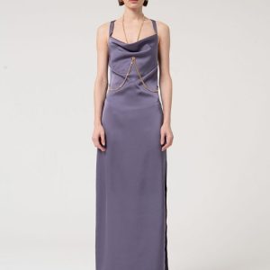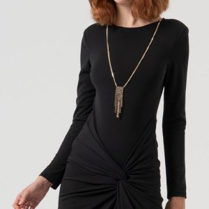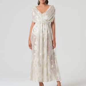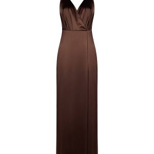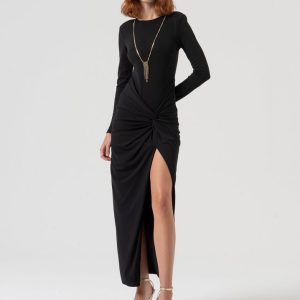 RINASCIMENTO Elegantna dolga obleka s prefinjeno broško in drapiranimi linijami – popolna za svečane in večerne priložnosti.