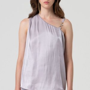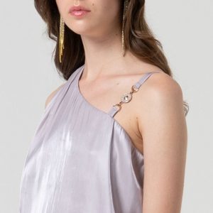 FRACOMINA Body iz sijoče tkanine z razkošnim kovinskim učinkom izžareva eleganco in samozavest. Preklopni V-izrez in okrasni detajl z zelenim draguljem na rami dodata pridih glamurja in prefinjenosti. Oprijet kroj lepo poudari postavo in ustvarja ženstven, sofisticiran videz – popoln za večerne priložnosti.