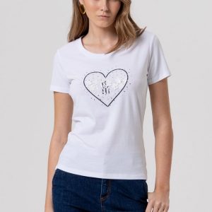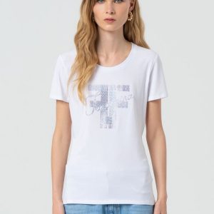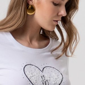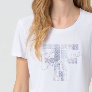 Izdelana je iz mehke in elastične tkanine z visoko vsebnostjo bombaža in modala, kar zagotavlja prijeten občutek na koži skozi ves dan. Klasičen kroj z okroglim izrezom in kratkimi rokavi poskrbi za brezčasen videz, aplikacija na sprednji strani pa doda kanček ženstvene elegance.