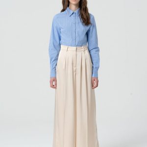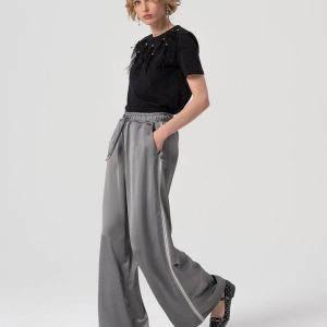RINASCIMENTO Široke hlače iz laminiranega satena z glamuroznim sijajem in elegantnim padcem – modne, lahkotne in popolne za posebne priložnosti.