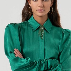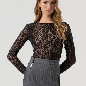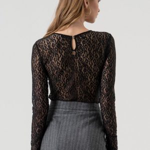 RINASCIMENTO Čipkasta bluza z učinkom volne izžareva popolno ravnovesje med eleganco in sodobnim slogom. Prosojna tkanina z razkošnim čipkastim vzorcem nežno razkriva silhueto in dodaja pridih zapeljivosti. Ovratnik iz imitacije usnja z bisernim gumbom ustvarja sofisticiran kontrast, ki bluzo naredi primerno tako za večerne kot formalne priložnosti.