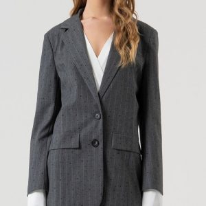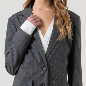 Eleganca z bleščečim pridihom! Ta siv blejzer z okrasnimi črnimi biserčki, združuje klasično prefinjenost in sodoben glamur.