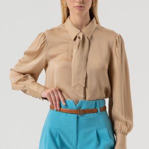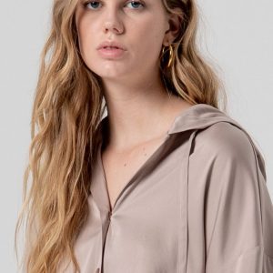 RINASCIMENTO Satenasta rožnata bluza s kratkimi rokavi, klasičnim ovratnikom in drapiranim sprednjim delom za prefinjen, moden in ženstven videz.