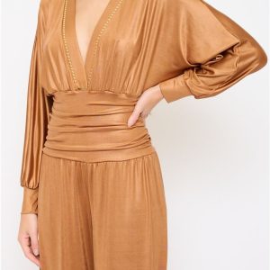 Eleganten kombinezon iz svetlečega blaga, ki se ponaša s sofisticiranim prekrižanim ovratnikom. Zaponka z dragulji v pasu doda glamurozen pridih, medtem ko zadrga na hrbtu omogoča enostavno oblačenje. Palazo hlače ustvarijo elegantno in sproščeno silhueto, zaradi česar je ta kombinezon popoln za večerne izhode ali posebne priložnosti.