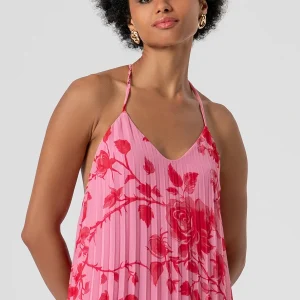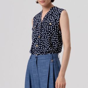 RINASCIMENTO Cvetlična brezrokavna bluza z visokim ovratnikom in rahlo plisirano teksturo za ženstven, svež in eleganten videz.