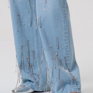 Moderna torbica v jeans videzu z dolgimi naramnicami in dekorativno verižico za trendovski videz.