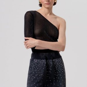 Elegantna srajca, ki izstopa s subtilnimi vodoravnimi črtami, narejenimi iz drobnih biserčkov. Preprosta, a prefinjena zasnova doda kanček razkošja vsakemu outfitu, hkrati pa zagotavlja udobno nošenje. Idealna za posebne priložnosti ali kot stiliziran dodatek k vsakodnevnemu videzu.